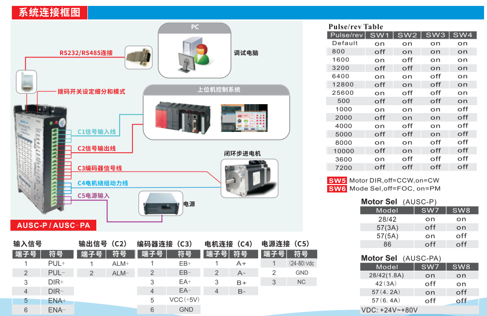 工作電壓:直流輸入電壓24VDC~80VDC,推薦工作電壓48V 連續輸出電流最大值8.2A,最大峰值電流13A(先進的步進伺服過載能力) 可接受差分和單端式脈沖/方向指令,控制指令最大脈沖頻率為500KHz(出廠默認為200KHz) 脈沖,方向和使能信號輸入接口電平為4.5-28V兼容 采用FOC磁場定位控制技術和空間矢量脈寬調制(SVPWM)閉環控制技術 采用了先進的變電流技術和變頻技術,有效的降低了電機和驅動器的發熱 每圈脈沖數可通過調試軟件或拔碼設定(細分) 具有過壓、欠壓、過流和超差等保護功能 具有串口RS232調試功能,但需使用本公司專用的串口調試線聯系艾而特