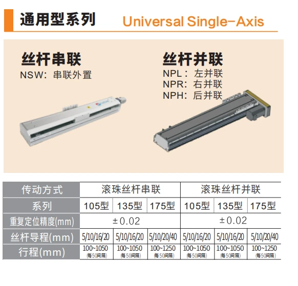 多種組合方式,靈活多變 利用專用連接件,可根據需要隨意將多條機械手組合使用,兩軸直角式組合、三軸直角式組合,三軸龍門式組合。 重復定位精度均為士0.02mm 重復定位精度:即機械手在同一點進行重復定位時,停止位置誤差的最大范圍值。 高強度、高剛性型材底座 底座采用高強度擠壓鋁合金型材,為中空加強結構,表面陽極氧化處理,保證了機械手運行時的剛性。